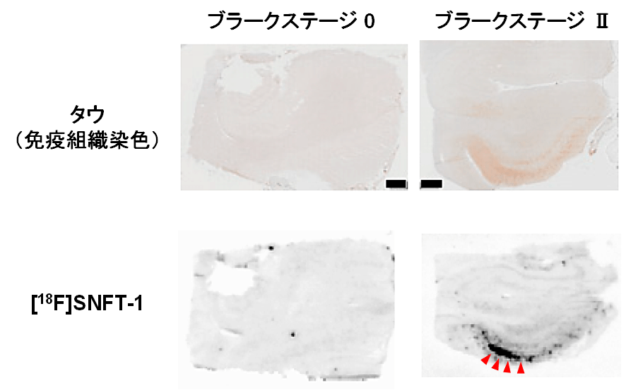 タウ病変がみられないブラークステージ0の脳標本(左)においては、[18F]SNFT-1の結合像は観察されません。これに対し、初期のタウ病変がみられるブラークステージⅡの脳標本(右)においては、タウの免疫組織染色と一致した[18F]SNFT-1の明瞭な結合像(赤矢頭)が観察されます。