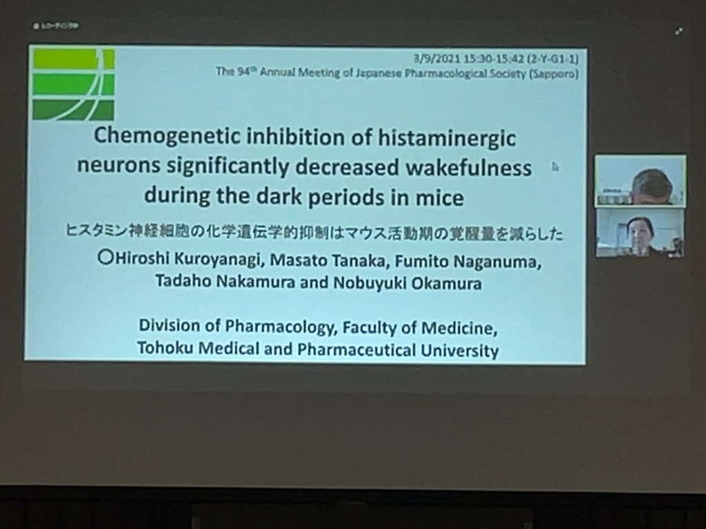 2021年9月23日にオンラインで開催された第72回日本薬理学会北部会(仙台)にて、長沼史登助教が令和3年度の西宮機能系基礎医学研究助成基金を受賞し、その受賞講演を行いました(発表タイトル:吸入麻酔薬がニューロテンシン神経細胞の神経活動に及ぼす影響の検討)。また村田大樹さん(M4)がM3の課題研究から進めてきた研究成果を発表しました(発表タイトル:脳内アミロイド・タウを生体画像化するための近赤外線蛍光プローブTHK565の性能評価)。