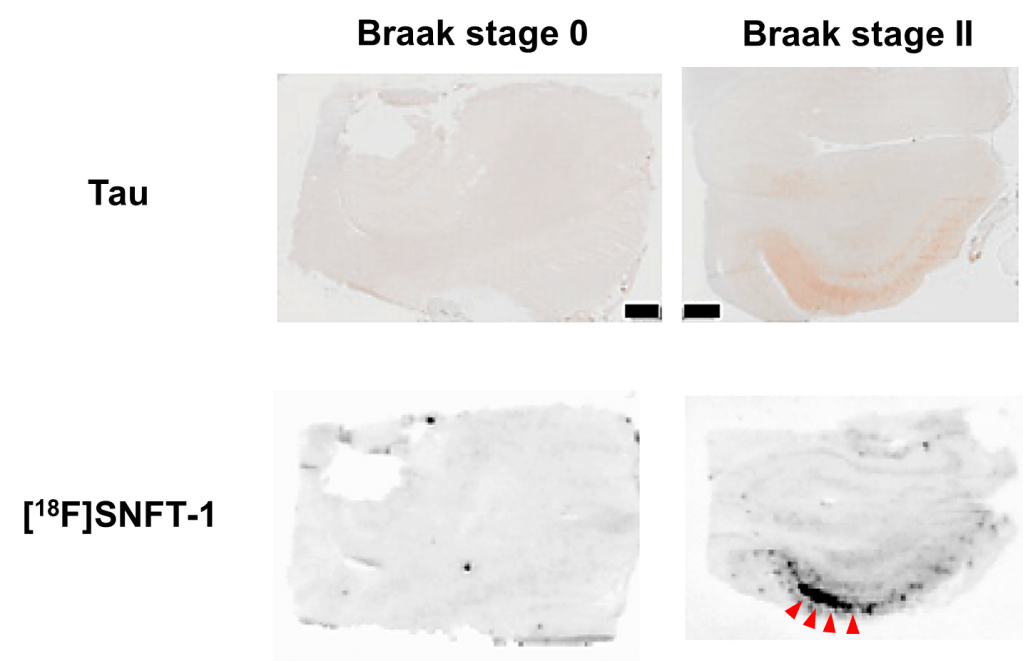 We performed in vitro autoradiography of [18F]SNFT-1 using postmortem brain samples from older adults who showed early Alzheimer’s disease pathology despite the absence of dementia symptoms. The results showed that [18F]SNFT-1 clearly delineated tau lesions even in Braak stage II brain sample, corresponding to the early stage of tau pathology (Figure 1).