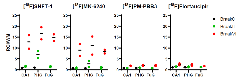 We compared the signal intensity of [18F]SNFT-1 at three locations (CA1, PHG, and FuG) with other existing tau PET tracers (Figure 2). The results showed that [18F]SNFT-1 was able to detect tau deposits in Braak stage II (green) and stage VI (red) with the highest contrast. This suggests that [18F]SNFT-1 may detect tau with higher sensitivity than conventional tau tracers.