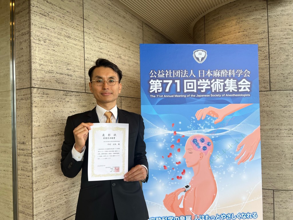 中村准教授が日本麻酔科学会第71回学術集会で最優秀演題賞を受賞しました。