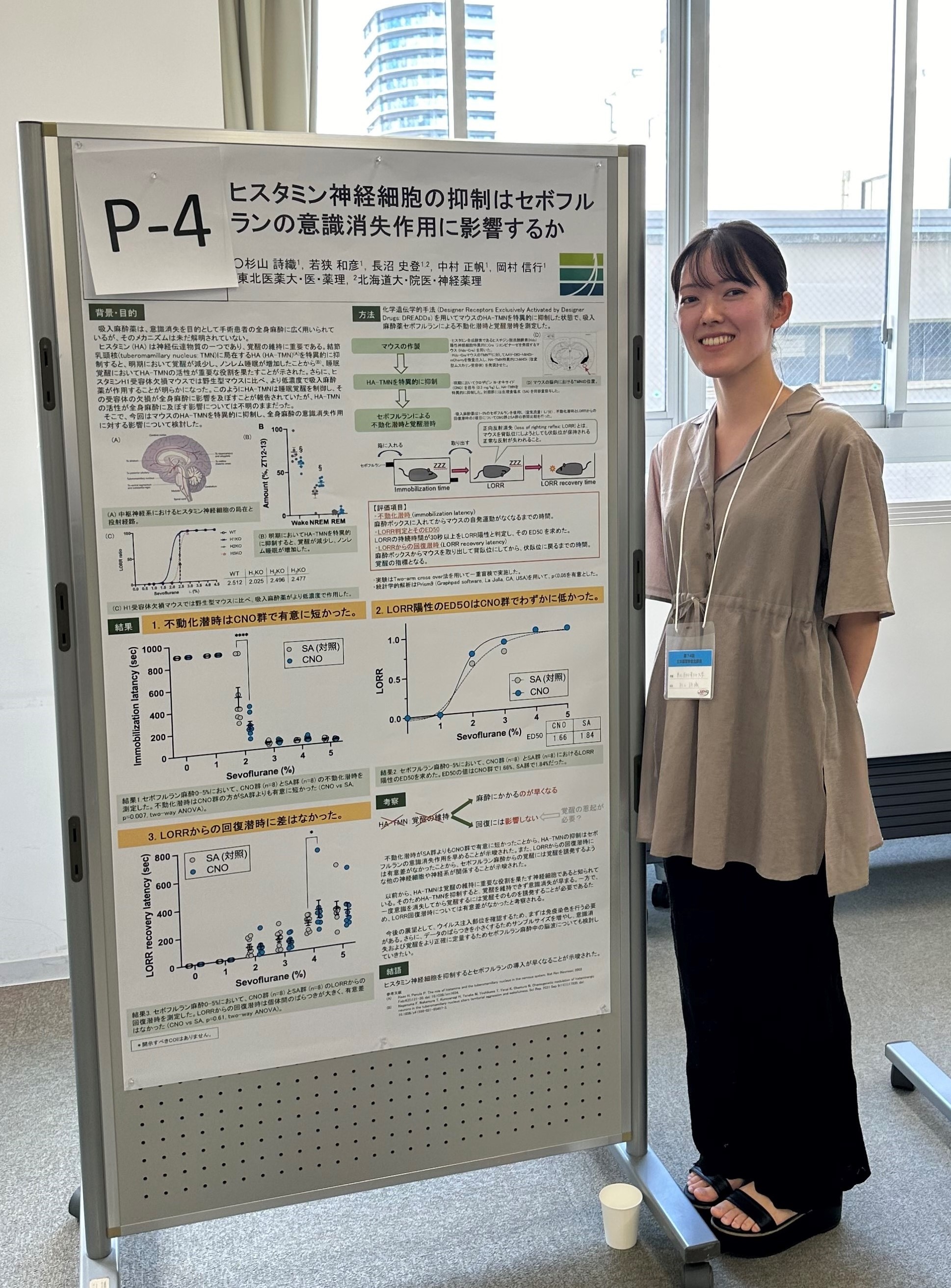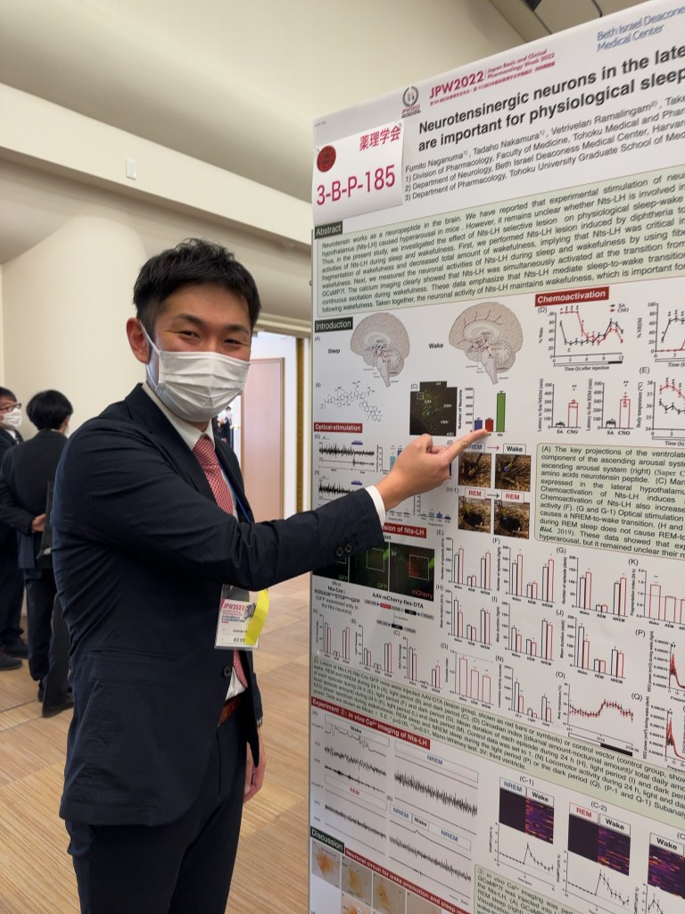 当教室で課題研究に取り組んできた若狭さんと杉山さんが第74回日本薬理学会北部会でポスター発表しました。若狭さんは「扁桃体中心核ニューロテンシン神経細胞のREM睡眠制御における細胞活性と神経投射について」、杉山さんは「ヒスタミン神経細胞の抑制はセボフルランの意識消失作用に影響するか」について発表しました。